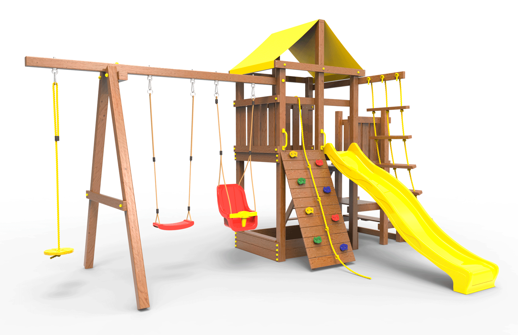 Обращаем Ваше внимание, что фактический цвет детской площадки может отличаться от представленных фото на сайте. Специфика окраски нетоксичными пропитками и красителями допускает отклонения в цветовой гамме отгружаемых изделий. Также обратите внимание, что фактический цвет может отличаться из-за цветопередачи устройства на котором Вы смотрите фото.