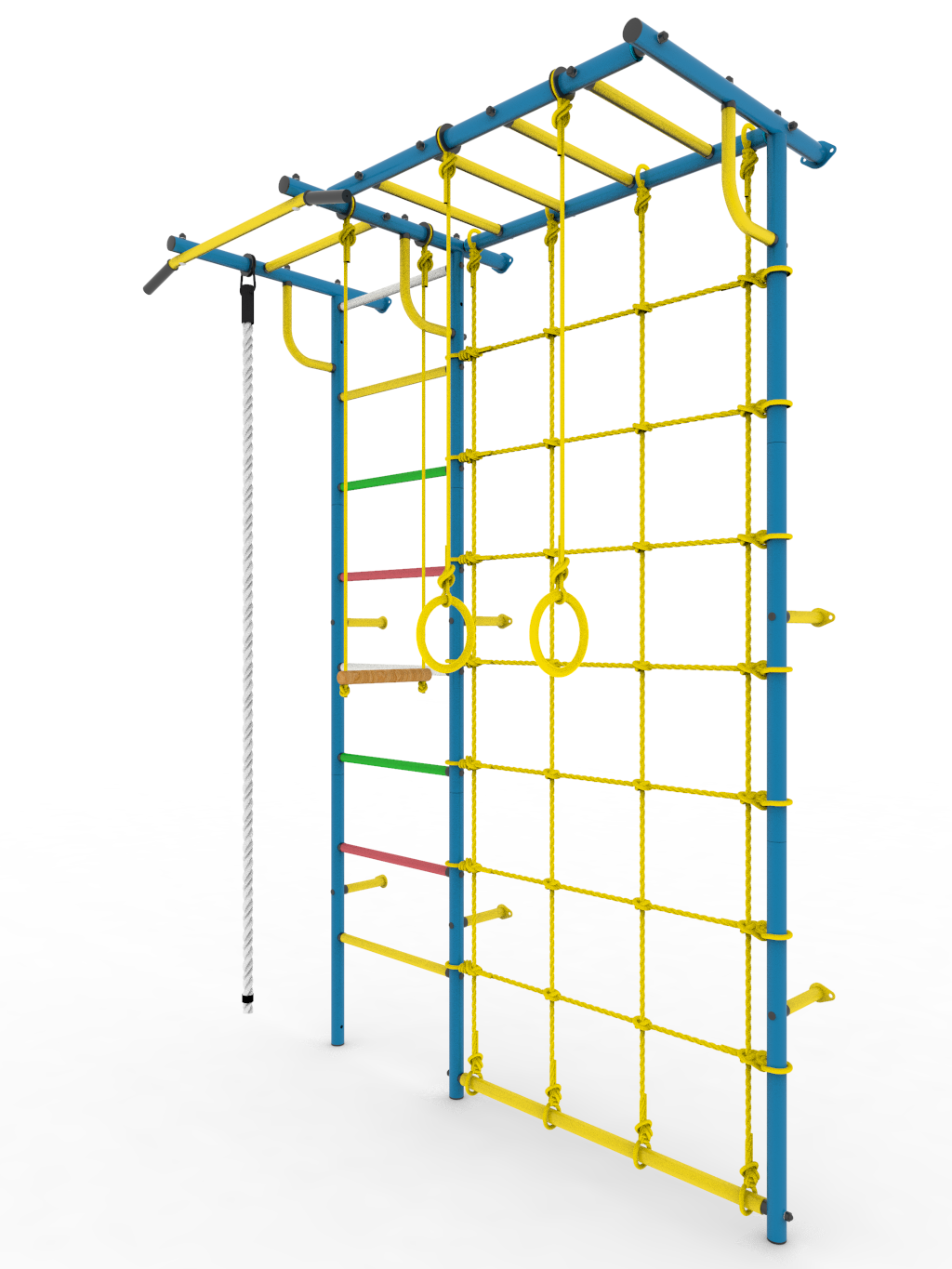 - Комплектация: турник, кольца гимнастические, канат, трапеция, сетка