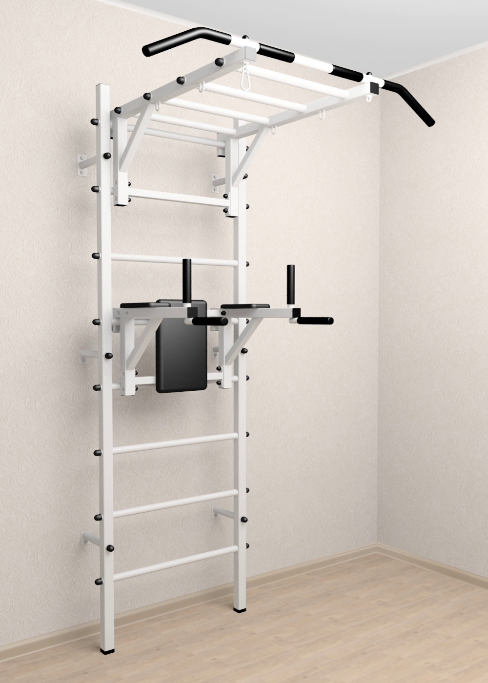 Стойки шведской стенки Sv Sport стандарт изготовлены из профильной трубы 40 х 40 х 2 мм. Ступени изготовлены из круглой, стальной трубы, покрытой резиной (не скользят, не натирают мозоли, не прокручиваются, не имеют запаха, приятны на ощупь). Устанавливается к стене при помощи 6 кронштейнов. На перекладину, в местах хватов, одеты резиновые ручки.
