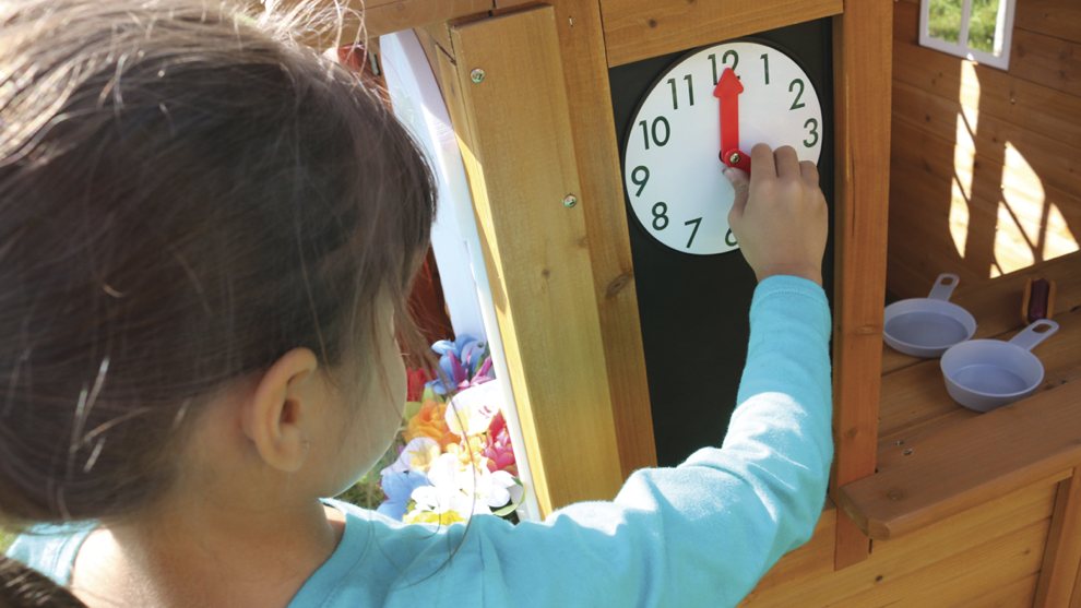 Игровая кухня является идеальным местом для творчества и кулинарии благодаря раковине, плите и кухонной утвари. В игровом домике есть две двойные доски для рисования мелом, часы, а также почтовый ящик и игровой телефон.
